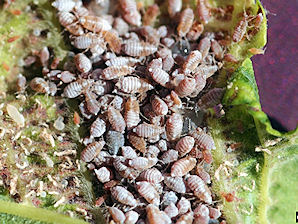 The Wingless Potato Aphid originated in North America but it has spread to the temperate parts of Europe and Asia and is found in all areas of the world where potatoes are grown. The wingless female potato aphid is green or sometimes pink, often with a darker dorsal stripe. It has a pear-shaped body reaching about four millimetres long. longer than the body. The winged female has a uniform darker colored body and appendages and has a green abdomen. The nymphs look like miniature versions of the adults and they go through several moults in the course of about ten days. The female potato aphids usually overwinter on weeds & they usually emerge in April and begin feeding on perennial weeds, preferring plants in the Chenopodiaceae family. Then in about May or early June, they migrate to potato, cabbage, tomato and others crops where they feed on shoots, the lower side of leaves, buds and flowers, often on the lower parts of the plant. They are highly polyphagous, feeding on over two hundred species in more than twenty plant families, but their preference is for plants in the Solanaceae family. While in some cases, high temperatures or heavy rainfall may reduce infestations and the numbers are naturally controlled by predators, parasites and pathogens. If numbers of aphids are sufficiently high, chemical control should be attempted using insecticidal soaps or poisons. This is not always effective because the aphids usually congregate on the underside of lower leaves where they are difficult to reach with sprays. A number of virus diseases are spread by Macrosiphum euphorbiae. These include lettuce mosaic virus, bearded iris mosaic virus, narcissus yellow stripe virus, tulip breaking virus, potato leaf roll virus, potato virus Y, beet mild yellowing virus and beet yellows virus.