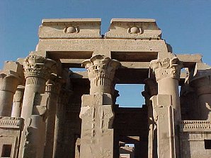 The temple at Kom Ombo is about 30 miles (48 km) north of Aswan and was built during the Graeco-Roman period (332 BC-AD 395). The name Kom Ombo (the ancient Greek settlement of Ombos) comes from the Ancient Egyptian word nubt which means City Of Gold. The town is located in the mouth of an old wadis which lead to the regions in which gold was mined. The temple of Kom Ombo is located upon a hilllock at the ancient site of Ombos which has been occupied from prehistoric times. A feature of the temples features is a double row of doors leading to a double sanctuary. The Northern half is dedicated to the falcon god Harwer, or Horus The Elder. The Southern half is dedicated to the crocodile god Sobek. The two gods are accompanied by their families. Harwers wife Tesentnefet (The Good Sister) and son panebtawy (Lord Of The Two Lands). Sobeks consort Hathor and son Khonsu. The Southern half develops the theme of the king entering the temple, followed by spirits bearing the produce of the Land of Egypt. On the inner face of the second enclosure is a unique illustration of surgical instruments. Sobek wears a crown of double plumes which rest on horizontal, curved ram�s horns. A sun disk sits at the center base of the plumes, and uraei (rearing cobras) rest on each side.