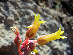 We wish to thank Wikipedia, the free encyclopedia for some of the information on this page. We share images and information with Wikipedia. Rock Echeveria is a blue-glaucous succulent which forms a basal rosette. It has bright yellow - orange, tube shaped flowers It seems to grow best in rock crevaces with little soil. In fact, Dudleya saxosa thrive in a very small soil volume, and the underground corm is the major supplier of water to the succulent leaves during periods of drought. This would make it an excellent Xeriscape plant. However, this subspecies is listed as a Salvage Restricted Protected Native Plant, by the Arizona Department of Agriculture. It is unlawfull to transport it without the proper paperwork and authorization.