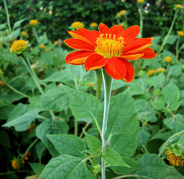We wish to thank Wikipedia, the free encyclopedia for some of the information on this page. We share images and information with Wikipedia. Mexican sunflower is a warm season annual with a stout, spreading habit, growing to 5-6 ft tall and 3-4 ft wide. The leaves are coarse, 3-lobed, 4-10 in long and 2-4 in wide. The leaves and stems are covered with a soft fur. The numerous flower heads are brilliant red-orange, like daisies or zinnias, and about 3 in across. The cultivar, 'Torch', was named as an All America Selection. Dwarf cultivars are also available.