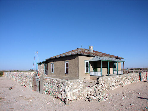We wish to thank Wikipedia, the free encyclopedia for some of the images and information on this page. We share information with Wikipedia. The McDonald Ranch House was the location of assembly for the first tested nuclear weapon. The test occurred on July 16, 1945; a plutonium bomb was tested, the type of weapon later dropped on Nagasaki, Japan. The weapon used against Hiroshima was a uranium bomb, a type not tested prior to its use in World War II, because it had a simpler design. The "gadget" was assembled there, the components having arrived on July 12. It was assembled on the next day, and winched up the Trinity test tower the following day. The George McDonald Ranch House sits within an 85' x 85' low stone wall. The house was built in 1913 by Franz Schmidt, a German immigrant, and an addition was constructed on the north side in the 1930s by the McDonalds. There is a display on the Schmidt family in the house during each open house. The ranch house is a one-story, 1,750-square-foot (163 m2) building. It is built of adobe, which was plastered and painted. An ice house is located on the west side, along with an underground cistern which stored rain water running off the roof. At one time, the north addition contained a toilet and bathtub, which drained into a septic tank northwest of the house. There is a large, divided water storage tank and a Chicago Aermotor windmill east of the house. The scientists and support people used the north tank as a swimming pool during the long hot summer of 1945. South of the windmill are the remains of a bunkhouse and a barn which was part garage. Further to the east are corrals and holding pens. The buildings and fixtures east of the house have been stabilized to prevent further deterioration. The ranch was evacuated under protest in 1942, when the Alamogordo Bombing and Gunnery Range took over the land to use in training World War II bombing crews. The house stood empty until the Manhattan Project support personnel arrived in early 1945. Delivery of the plutonium core for the Gadget to the assembly room in the McDonald Ranch House. Inside the house, the northeast room (the master bedroom) was designated the assembly room. Workbenches and tables were installed. To keep dust and sand out of instruments and tools, the windows were covered with plastic. Tape was used to fasten the edges of the plastic and to seal doors and cracks in the walls. The explosion, only two miles away, did not significantly damage the house. Most of the windows were blown out, but the main structure was intact. Years of rain water dripping through holes in the roof did much more damage. The barn did not do as well. During the Trinity test, the roof was bowed inward and some of the roofing was blown away. The roof has since collapsed. The house stood empty and deteriorating until 1982, when the U.S. Army stabilized the house to prevent any further damage. Shortly after, the Department of Energy and U.S. Army provided the funds for the National Park Service to completely restore the house. The work was completed in 1984. All efforts were directed at making the house appear as it did on July 12, 1945. THIS SITE IS ONLY OPEN TO THE PUBLIC, TWO DAYS OF THE YEAR: 1ST SATURDAY OF APRIL & 1ST SATURDAY OF OCTOBER! How To Get There: (1) Stallion Gate Entrance - Exit I-25 on mile marker 139 (San Antonio, N.M.) and head 12 miles east or exit Highway 54 onto Highway 380 and head west 53 miles of Carrizozo, N.M. Turn on the Stallion Gate entrance and head south five miles of Highway 380.The gate is opened from 8:00 a.m. to 2:00 p.m. Visitors are allowed to enter and exit unescorted anytime during these special days. (2) Alamogordo Alternative - The Alamogordo Chamber of Commerce sponsors a convoy for visitors that desire a tour. The Alamogordo caravan meeting site will be at the Tularosa High School Athletic Field Parking lot. Turn west off Hwy. 54/70 in Tularosa at Higuero St. Proceed west to La Luz Ave. Turn right on La Luz Ave. (north) to athletic field. Line up will begin at 7 a.m. Caravan departs at 8 a.m. Visitors entering this way will travel as an escorted group to and from Trinity Site. The drive is 145 miles roundtrip and there are no service station facilities on the missile range. The convoy is scheduled to leave Trinity Site at 12:30 or 1 p.m., depending on its size, for the return to Tularosa. The convoy may leave later if there is a large number of vehicles returning. Cameras are allowed at Trinity Site but their use is strictly prohibited anywhere else on White Sands Missile Range. For more information contact the missile range Public Affairs Office at (575) 678-1134.
