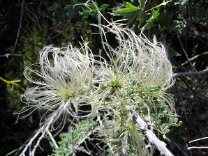 We wish to thank Wikipedia, the free encyclopedia for some of the information on this page. We share images and information with Wikipedia. Old-man's beard is a vine with slender, woody stems that grows in dry washes and canyons in West, Central and South Texas. It can have a shrub-like shape, but usually climbs along the ground or over shrubs and trees by loosly twining petioles. It is dioeceous, with male and female flowers on separate plants. Flowers on both are inconspicuous, appearing in spring and summer, but on females they are followed by extremely showy fruits with 3-inch-long silvery tails from August through October. The opposite, pinnately compound leaves are decidous. It is cold hardy into the teens, but will grow from the roots the next spring after a freeze. It can tolerate moisture as well as drought, although it does best in well-drained soil. Once established, old-man's beard is almost impossible to eliminate. Full sun to partial shade, little water required