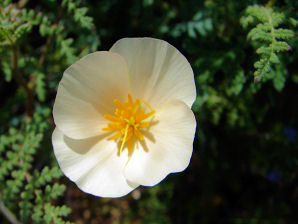 We wish to thank Wikipedia, the free encyclopedia for some of the information on this page. We share images and information with Wikipedia. It appears that a mutation has occured to the California Or Mexican Gold Poppy that is common to Arizona. There is also a new cultivated variety called "White Linen" California Poppy ( Eschscholzia californica white linen ). It is thought that the 'White Linen" is not the same as the Mutant Variety found on the remote Arizona deserts. For some reason there are a lot of the Mutants being found during March of 2009 at Bartlett Lake, Arizona. The mutation in these photos have yellow to gold pollen. Some of the Bartlett Lake mutations have a pinkish color to the petals. Some have a slight gold color to the petals edges. Another mutation is noted in the literature. It was found in California and it has both white pollen and white petals.