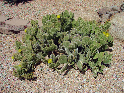 We wish to thank Wikipedia, the free encyclopedia for some of the information on this page. We share images and information with Wikipedia. A very attractive Opuntia with tiny, silver - whitish colored, soft, fuzzy looking glochids. It has no spines. But, the attractive glochids are deceptively nasty. They stick to your skin with the slightest touch or movement of air and then they are very difficult to remove. If moving the plants, wet them down before working near them. That way you reduce the blowing away of the glochids. The best method we have found to remove the glochid spines is to coat the area affected with Elmer's Glue and let it dry. Then you can peel the glue off. Almost all the spines will pull out with the glue. Sometimes, we chew gum when working with this cactus. Then you can roll the gum over the affected area and remove many of the spines. Another way to remove these particular spines is duct tape. Press tape down carefully going in one direction, remove it quickly going the other. Follow up with tweezers, and a magnifying glass, in good light. These plants are great for Xeriscape Gardens, especially in an area that you want to protect from trespassing. It keeps dogs, raccoons, & trespassers out of areas of your yard where you don't want them! We placed them in a corner of our yard that we wanted to protect. No More Problems! This species is also very prone to rot if watered to much via sprinklers. It cannot grow in the shade. It requires dry soil and can tolerate drought. The closely related Opuntia rufida differs by having reddish-brown glochids; it is found native further north than Opuntia microdasys, in northern Mexico, and also into western Texas. Some botanists treat the two as a single species.