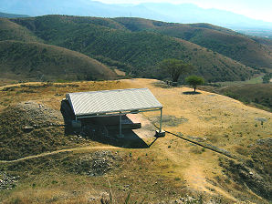 Huijazoo Archaeological Ruins, Also Known As: Cerro de la Campana and Suchilquitongo. Located at, San Pablo Huitzo, Oaxaca, Mexico. San Pablo Huitzo is located 19 miles (31 kilometres) Northwest of the City of Oaxaca via highway 190 to Mexico City. Approximate travel time is 0:35 minutes. San Pablo Huitzo has a small musem of Pre-Hispanic pieces and colonial religious art. The following information concerning the tomb number five at Huijazoo comes from: Restoration of Tomb No. 5 of Huijazoo; by Veronica Fernandez de Castro; a paper presented at the 1989 WAAC Annual Meeting in Honolulu, Hawaii. "The Tomb of Huijazoo dates from the Classical Period of the Zapotec culture (650-900 BC). It is located 29 kilometers to the north of the city of Oaxaca, now the capital of the State, in Etla Valley which is part of the municipality of Suchilquitongo. To arrive at the site one must cross the town of Suchilquitongo, and travel down two kilometers of narrow road, then continue on foot for the next 60 meters. At the site there is an esplanade made up of three mounds. The middle one is the principal pyramid, with a stone cross on the top where the people of the nearby town venerate their patron saint every year. On the right side of this mound is another which is as yet unexplored. On the left there is another small mound and under this one we find the tomb. The entrance is strategically placed: all approaching roads can be clearly seen. The tomb is located under the mound at a depth of five meters. Access is by way of stucco-covered steps. The entrance was blocked by a large stone which has been removed. Above the lintel there is a large stucco-covered mask worked in high relief, which is said to be the face of a snake with open jaws, from which the face of a red bird with large eyes emerges. Following this there are two antechambers: the first is made up of two narrow niches where there are some designs of a red-orange coloring, but most designs have been lost; the second antechamber consists of two niches with three polychromatic walls representing various human figures. On the north wall of the west niche, one can see a complete figure, totally dressed, which appears to be a priestess. She is wearing green and ocher earflaps, an elaborate headdress with rich plumage, and a dark red and white huipil. In her right hand she holds a green, orange and brown copal bag, the complete design outlined in black. In this room there are four lintels covered in stucco, in the center of each is a square painted red. Above the north lintel there is a large mask worked in high relief which is said to be the face of a jaguar with open jaws, wearing an elaborate headdress with geometric designs. From the jaws of the jaguar emerges the face and arms of a figure resembling a bat. These lintels rest upon stone blocks called jambs. There are ten jambs, each carved in bas relief, of distinctive figures with detailed vestments, painted red. The floor of the tomb, as well as the steps to the funerary chamber, are made of stucco-covered earth. The funerary chamber consists of three walls, the east and west divided horizontally by a white line. The base of the walls is red- orange and the upper part shows a procession of human figures. All the figures wear headdresses of green feathers, as well as light brown dresses, pectoral plates and sandals. The faces of each have different expressions. Some of the figures have lost part of their detail and coloring. The lower level of the walls shows human figures of a different type, larger than those of the upper level, and their faces are those of animals such as jaguar and snakes. Their vestments are similar, consisting of a short skirt, bead necklaces, earflaps, and in one hand they carry a copal bag, while in the other they hold a stylized flower. All of the figures are facing north. The north wall is the smallest, and has the fewest images. One can make out some green feathers and the remains of painted faces. In the central and highest part of the wall there is a small niche. A stele decorated in bas relief was found in this room. It is divided in two parts: on the upper part there are two human figures, a young man with a skirt and bare torso, and in front of him an older man wearing an elaborate headdress, sitting in a position of higher rank. In front of this second figure there is a glyph of the long-nosed god wearing earflaps and a necklace, as well as a number glyph representing thirteen monkeys. On the lower part of the stele are the figures of a woman and an old man. In the interior of the tomb various clay urns and vessels were found, as well as the skeletal remains of a young man. The peaked roof is made of large stone blocks, and the spaces between these are filled in with small stones and earth. The type of stone used to make the tomb can be found near the site and continues to be used by local people for construction." Our guide and driver, Adan Fernando Castaneda, drove us to the foot of the hill that the ruins are located on without much effort. The road was blocked at the base of the hill with large stones laid in place so that we could not go any further by car. We then walked the last 60 meters up the hill to the ruins. Adan walked and sometimes ran ahead of us to show us the easiest way up the hill. We are certainly grateful to him for his assistance. Since George is an astronomer and has been one for over thirty five years, he always is looking for astronomical alignments. One unusual alignment that he noticed is that the entire plan of this city seems to be on a very different alignment than most of the cities in Mesoamerica. It seems to be aligned on a SE to NW alignment. Since we were only there for about 45 minutes, we were unable to perform much of a study of the alignment and we would like to see further work on this hypothesis. We suspect that the alignment may have been to the solstices rather than to equinox alignments as most of the Mesoamerican ci