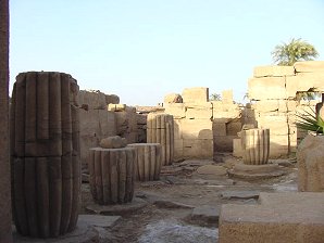 The Temple Of Karnak, Ipet Isut (the most hallowed of places) designates the center of the world where Amun, the creater of the universe, first created himself and then all living beings. His kingdom on earth was ruled by his beloved son, Pharaoh. Amun resided in his temple at Karnak and mankind could maintain cosmic harmony by worshiping Amun in the temple. The coronation of Pharaoh and jubilees were also held here. Eighty thousand people served in the temple during the reign of Ramesses III. For over two thousand years Amun-Re was worshiped at Karnak. The Temple is entered along the access road that is built on the original site of the canal that linked the Temple Of Amun with the Nile River. In ancient times the sacred barque of Amun would sail from the Nile through the canal to the Chapel Of Achoris at the Temple Of Amun-Re on ceremonial voyages.