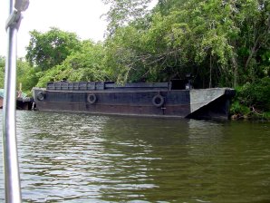 | We See The Sugar Cane Processing Plant At The Rivers Bank. | Cane Barges Used To Transport Sugar Cane, For Processing. |