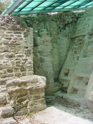 As of today, Lamanai is the only known Mayan ruin still using part of tis original Mayan name. Before the Spanish conquest, Lamanai was called; Laman'ayin. Laman'ayin means ("submerged crocodile"). During the time of the conquest the Franciscan monks corrupted the name from "Laman'ayin" to "Lamanai." The name "Lamanai" means submerged insect. Not ("submerged crocodile")! Then, in 1978 archaeologists realized that the Franciscan monks had corrupted the name from "Lam'an/ayin" to "Lamanai." Therefore, the archaeologists corrected the name by adding the suffix of "ayin" to the Spanish mistake. Thus correcting the meaning of the name from "submerged insect" to "submerged crocodile." This would also be a logical conclusion supported by the large number of crocodile representations found at Lamanai; such as pottery decorations, & figurines. Then also upon the headdresses of the 13 foot & 15 foot tall limestone masks, found upon the 6th century Temple Of The Masks platform. With all of this being said, the name Lamanai, is what the ruins is called today. It is interesting that the name "Laman'ayin, also contains the name of a Book Of Mormon Lamanite rular, King Laman, who according to Professor of Archaeology, Joseph L. Allen; this ruins could have been named after. (The names, locations, activities of the people, and time period fit.) When we visited with Dr. David Pendergast, who spent several years investigating this site, we learned that only about 5% of the site has been investigated and much remains buried or covered by jungle and bush. He told us that the city is located on about 950 ares and that the the site's core is about a 12 square miles in size. He also told us that the Lamanai contains about 100 structures, one ball court, and 12 major structures. Among the major structures there are the Temple of the Jaguar Masks, the High Temple (so-called because of its height), and most notably the Temple of the Masks, thought to be either an Olmec God, or Kinich Ahau, the Maya Sun God. We also learned that many structures were built on top of other structures, with the older structures frequently razed, or at least partially razed, before reconstruction. In doing so the builders would sometimes leave masks and other ornamental features from the older buildings in some rather odd positions in the newer buildings, such as in the stairwells. We also learned that Lamanai was built differently than most of the other Maya sites in Belize. Most of the other Maya sites in Belize are generally organized in plazas around a ceremonal structure. But, at Lamanai, most of the ceremonial buildings were built along the west bank of the New River and the New River Lagoon. Then the residential structures were built to the north, west and south. If you visit Lamanai, you will only be visiting the major part of the site as most of it is still undeveloped. But you should plan on staying on site for about 2 hours. If you have more time; in addition to the Mayan buildings and artifacts, the Lamanai site also includes the remains of a 19th century sugar mill, a brick-lined reservoir and the charred remains of two 16th century Catholic churches. The Maya burned each of the 16th century Catholic churches because of their anger over the Catholics building their churches upon the ancient Mayan Temples in an attempt to subject the mayans to Spanish Rule and to the Catholic Religion. The ruins of Lamanai, one of Belize's largest ceremonial centers, are located on the banks of the 30 mile long New River Lagoon in North Central Belize. Lamanai features the second largest Pre-Classic structure in the Maya world and the view across the surrounding forest from the top of the temple is magnificent. Lamanai has been continuously occupied for over 3000 years. Lamanai's remoteness contributed to it's continuous occupation beyond most other Maya sites, until at least 1,650 AD. The Mayan ruins of Lamanai Belize brims with exotic birds and hydrophilic iguanas. There is evidence showing the Mayan life here that dates from about 1500 B.C. through the Postclassic Period (A.D. 950-1544), and Spanish colonial times (A.D. 1544-1700). There is an abundance of wildlife inside the park surrounding Lamanai. There are at least seven families of howler monkeys that make Lamanai their home and you will most likely see a couple of them peering down through the branches as you wander the trails. In addition, the marshlands around the lagoon supports many species of water birds and wildlife, including crocodiles. Lamanai is spread out along the west bank of the New River Lagoon at a point where the New River flows from the lagoon on its 80-mile journey, north to Chetumal Bay and the Caribbean. The New River, known to the Maya as Dzuluinicob ("foreign men") was one of the arteries used by the conquering Spaniards and missionizing friars as they attempted to penetrate the forests of the Maya lowlands. Page One will show the trip up The New River, past the sugar cane processing plant to the visitors center. It also will feature the "Temple Of The Masks", also known as Structure "N9-56".. Page Two will feature the small museum at the site near the visitors center. When on site we were fortunate enough to meet Dr. David Pendergast and he was kind enough to show us some of his work (he had just minutes earlier, made a discovery) and he let us observe his work on that discovery. The small photos below were taken on May 19, 2003 at about 11:30 am. The photos were taken just two weeks before the rainy season had begun for 2003. The larger photos were taken on November 16, 2012; when we visited the site on a tour by Dr. Joseph L. Allen, professor of archaeology, and his son Blake Allen.