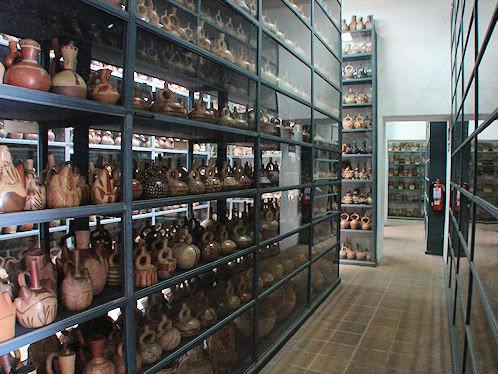 The Larco Museum in Lima, Perú: The Larco Museum (Spanish: Museo Arqueológico Rafael Larco Herrera) is a privately owned museum of pre-Columbian art, located in the Pueblo Libre District of Lima, Peru. The museum is housed in an 18th century vice-royal mansion built over a 7th century pre-Columbian pyramid. It showcases chronological galleries that provide a thorough overview of 4,000 of Peruvian pre-Columbian history. It boasts one of the world's largest collections of pre-Columbian art including Moche, Nazca, Chimú, and Inca pieces. Additionally, the Larco Museum is well known for its gallery of pre-Columbian erotic pottery. The Larco Museum or Museo Arqueológico Rafael Larco Herrera is located at: Av. Bolivar 1515, Pueblo Libre. Lima 21, Perú. They can be contacted at: Telephone (00511) 4611312 - (0511) 4611835 or Fax (00511) 4615640. It was one of the first museums in the world to make its entire 45,000 piece collection available in an online electronic catalog. When touring the facility you can see this operation in the museum, but it is not open to the public. In 1925, Rafael Larco Herrera acquired a collection of vases and other archaeological pieces from Alfredo Hoyle, who was his brother-in-law. There were approximately 600 ceramic pieces in all. The arrival of these objects ignited a collector's enthusiasm in his son, Rafael Larco Hoyle. Soon after, Larco Herrera left his son in charge of the collection and those pieces completed the first collection of what would become the Rafael Larco Herrera Museum. During that same year, Larco Hoyle received some advice from his uncle, Victor Larco Herrera, a founder of the first museum in Lima. He urged Larco Hoyle to form a new museum in Lima, one that could guard all the archaeological relics that were continually being extracted by clandestine excavators. Larco Hoyle agreed with his uncle and proceeded to create a museum that would carry on his father's legacy. Larco Hoyle purchased two large collections: 8,000 pieces from Roa and 6,000 pieces from Carranza. He also purchased several small collections in Chicama Valley, Trujillo, Virú, and Chimbote. Within a year, the collection had grown significantly and display cases were installed in a small house on the Chiclín estate. On July 28, 1926, Independence Day, the museum opened its doors to the public. The Larco Museum now lends some of its collection to its sister museum, the Museo de Arte Precolombino (Pre-Columbian Art Museum), located in Cusco, Peru. The Larco Museum has several permanent exhibitions. The Gold and Silver Gallery showcases the largest collection of jewelry used by the many notable rulers of pre-Columbian Peru. It includes an impressive collection of crowns, earrings, nose ornaments, garments, masks and vases, many finely wrought in gold and decorated with semi-precious stones. The Erotic Gallery on the bottom floor of the museum, near the terrace and garden of the museum, has become one of South America's most popular attractions. Ancient Peruvian cultures represented their daily lives in ceramics, and this gallery holds the world's largest collection of erotic ceramics. Many are shown on this webpage. The Cultures Gallery exhibits 40,000 years of Peruvian pre-Columbian history. This chronology-based gallery provides visitors with a comprehensive view of cultures that existed in pre-Columbian Peru through the extant indigenous art that has survived since the 16th century Spanish conquest. This hall is divided into four areas: North Coast, Center, South and cultures from the highlands. Showcases have been ordered according to cultural sequence: