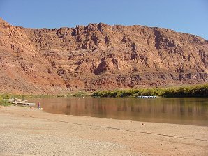 In about 1861 to 1863, Brigham Young had directed various LDS church members to settle along the Little Colorado River in Arizona and in other places in Arizona which made it necessary to be able to cross the Colorado River and to enter into Arizona. In March of 1864, Mormon frontiersmen and Indian missionary Jacob Hamblin and his men built a raft at the mouth of the Paria and made the first successful crossing at the point on the Colorado that would become Lees Ferry, transporting all fifteen men, their supplies and horses. Hamblin was on a mission to warn the Navajo of northern Arizona to stop making raids into Utah, stealing livestock and threatening Mormon expansion. The lands into which the pioneers wanted to move was viewed as "unsettled" territory, theirs for the taking under the precepts of Manifest Destiny, despite millennia of native occupation. Over the next few years, the "war" between the natives and the Mormons escalated, with the Paiute beginning to make raids on other pioneer settlements as well. In an effort to deflect native threats to their vulnerable southeastern frontier, the Mormons posted guards at the Ute Ford/Crossing of the Fathers and at "Pahreah Crossing" (Lees Ferry) in the winter of 1869-1870. A small stone building and corral were erected and named "Fort Meeks." With the help of local Paiutes, Hamblin cleared some land along the Paria, dug an irrigation ditch, and sowed some wheat. This first farming attempt at Lees Ferry, however, was a failure. The years from 1876 to 1890 were the busiest ever for the ferry operation. Successful Mormon colonization along the Little Colorado River in Arizona funneled increased emigrations through Lees Ferry. In addition, the completion of the Mormon Temple in St. George, Utah brought Mormon couples from Arizona settlements to have their marriages solemnized in the temple, earning the road in between the informal title, "The Honeymoon Trail." Ferriage fees for Mormon travelers at the time were $2.00 per wagon, $1.00 per horse and rider, and $0.25 per head of stock, while non-Mormons paid about 50% more. Located 15.3 miles (24.4 km) down the river from Glen Canyon Dam, Lees Ferry is a meeting of the old and the new. A natural corridor between Utah and Arizona, Lees Ferry figured prominently in the exploration and settlement of the surrounding canyon country. The Lees Ferry and Lonely Dell Ranch Historic Districts offer a glimpse into western pioneer life of the late 1800s. Lees Ferry may be reached from Page by driving 23 miles (37 km) south on Hwy. 89 to Bitter Springs. Then turn north on Hwy. 89A and drive 14 miles (22 km) to Navajo Bridge. The Lees Ferry junction is approximately 300 yards (90 m) west of the bridge, on the right. Located approximately 100 yards (90 m) upriver from the boat launch ramp on the Colorado River are several historic buildings. The small rock structure, built by Charles H. Spencer in 1913, functioned until 1923 as a post office for area residents and gold miners working the canyons. The largest and most historically significant building in this area is the rectangular structure commonly called Lees Ferry Fort. Built by Mormons from St. George for protection during the Navajo uprising in 1874, the building later served, in an effort to restore friendly relations, as a Navajo trading post. Farther upriver, from 1916 through the 1950s, the U.S. Geological Survey constructed several buildings from which the water flow of the Colorado River was measured. Yet farther upriver, the American Placer Company, owned by Charles Spencer, attempted gold extraction from the chinle shale in the early 1900s. A large boiler and the sunken remains of the steamboat Charles H. Spencer can be seen. Approximately one mile (1.6 km) upriver from the historic district is Lees Ferry's most important ferry crossing site. Here, ferryboats operated from 1873 to 1928. Most of the early Mormon emigrants from Utah, heading to Arizona, crossed the river at this site. In 1871, John Doyle Lee (for whom Lees Ferry is named) became the first permanent resident of the area. Lee established a ranch on the valley floor within a large meander of the Paria River. When Emma Lee first saw the isolated valley that was to be her home, she cried, "Oh, what a lonely dell," and ever after, the place was known as Lonely Dell. Crops and livestock raised here provided economic support for ferry operators, their families, and others through the 1940s. Located at the ranch site is a log cabin believed to have been built by John D. Lee in the early 1870s. The small log building near the cabin was used as a blacksmith shop. A fruit orchard of pear, apricot, peach, and plum trees is maintained by the National Park Service, creating a semblance of the historic scene. A long rock building, constructed in 1916 by the Bar Z Ranch, functioned as a hub for cattle ranching activities. Leo and Hazel Weaver, two of many ranch owners, added a wood-frame wing on the east end of the rock house in 1936. The ranch cemetery, located about 200 yards (180 m) northwest of the ranch buildings, contains graves dating from 1874 to 1928. Buried here are four of Warren Johnson's children, who contracted diphtheria from a passing traveler and died within a period of four weeks. This is rugged country. Temperatures can be extreme, ranging from 0�F in the winter to 110�F in the summer (-18� to 42�C). Flash floods are possible during stormy weather and can occur even when the sky is clear overhead. Always carry plenty of water - one gallon (4 L) per person per day is recommended. Ask at the ranger station for further information and current hiking conditions. One Mile River Trail - This trail starts at the Lees Ferry Historic Fort and follows the old wagon road to the upper ferry crossing site. The two-mile round-trip walk takes about an hour. Spencer Trail - This very strenuous trail, which is not maintained, begins at marker post #6 along the One Mile River Trail and cl