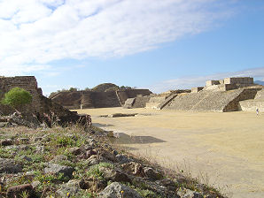 Monte Alban: Description One. Spectacularly located on an artificially leveled mountain top, Monte Alb�n (White Mountain) overlooks the three valleys of Oaxaca. It is said to have been built by the Zapotecs as a 'capital' city to govern the area, hence its position and elevation. Of course, there were no natural water supplies, so that the effort required to level the site and move stone up the mountainsides must have been immense. History Monte Alb�n was founded around 700BC, when population growth in the area was sufficient to support a religious �lite. It became the most important center in the area, and by 300AD had a population of about 50,000 - more than any European city at the time. Residential areas were built on terraces down the hillside, and all water supplies had to be carried up from the valleys. Many early structures were razed or built over, one of the earliest structures known today is the "Monumento de los Danzantes", featuring the first examples of writing found in the region. Intensive construction at the site continued until around 900AD, when the city began to lose political influence to other powers, such as Mitla. The Mixtecs began to dominate the Zapotecs, and Monte Alb�n, almost deserted by 700AD, became more of a religious site - the Mixtecs buried their leaders in elaborate tombs here. Later invaders were the Aztecs and then the Spanish, who gave the city its current name. The Site Most of the structures surround a vast plaza, orientated north-south. There are large platforms to the north and south; you'll enter at the north-east corner. Founded around 700BC, Monte Alb�n grew to a population of 50,000 by 300AD To your left you will see the ball-court. Zapotec ball-courts differ from those of the Maya in several ways; there are no stone rings and the court is shaped like a capital I. The sides of the court were sloping, but experts think that these walls were used in the game and were not for spectators. There is no evidence of human sacrifices related to the ball game in the Zapotec culture. However, the game seems to have involved moving the ball using elbows and hips similar to the method of play used by the Maya. The Northern platform was probably the major structure on the plaza, though much of it is in ruins now and it's difficult to imagine its original glory. There are several broad stairways offering great views of the valley. On the west side are two almost identical structures, with steps up to a platform and a walled enclosure at the base. There are remains of a four-tiered pyramid that would have been crowned by a temple. The Monumento de los Danzantes is carved with naked human figures in strange positions Between these two buildings is the Monumento de los Danzantes (the Dancers). The sloping faces are carved with naked human figures in strange positions, originally thought to be dancers. Their real significance is unknown, but the most popular theory is that they depict some sort of medical textbook - maybe this was a kind of hospital. Various deformities can be made out, and one figure is clearly a woman in childbirth. Date glyphs near the carvings are from about 600BC. In the center of the plaza are two constructions, the largest (in three sections) was a temple system that included tunnels to other temples on the site - presumably so that the priest could make sudden and magical appearances. The second building is the only one not aligned with the cardinal points and is thought to have been used for astronomy, hence its name 'The Observatory'. In its construction, about 40 carved slabs from the Monumento de los Danzantes were used. There are depictions of rulers above glyphs representing place names, presumably a list of conquered towns. The southern platform houses the tallest structure, an unrestored pyramid. This is the best place to take photographs and view the site as a whole. Before you leave, visit the tombs just north of the main plaza, where the Mixtecs buried their rulers. Important collections of jewelry were found here, most notably in Tomb 7 whose contents are on display in the museum at Oaxaca. The Zapotecs completed Monte Alban, a great ceremonial center begun during the Formative era on a flattened mountain top 1300 feet above the valley floor. The oldest extant structure, noted for the bas-relief sculptures of the danzantes (dancers), shows some characteristics of the Olmecs. The influence of the lowland cultures of Chiapas and the Maya, as well as Teotihuacan, is apparent in subsequent phases in the site's development. But the Zapotecs brought Monte Alban to its zenith between 600 and 900 AD. In the Post-Classic Period the Zapotecs lost their domain to the neighboring Mixtecs who, through warfare and marriage, established a federation of city-states in the region and turned Monte Alban into a necropolis. The Mixtecs left much of their history recorded in magnificent deerskin codices. The culture is noted for excellent craftsmanship in precious metals, turquoise mosaics and ceramics. A word about the vendors on site. They are just trying to make a living. They can be very pressing. If you really want something. Pay about 30% to 50% of what they are asking. Very rarely do they make the stuff they sell. Even if they say they do. They will also try to sell "originals" or "antiques." Some may be the real thing. Most are fake. To make an "antique" you simply take a freshly made artifact and burn it in cow chips. Then it looks like the real thing. It is unlawful to sell, buy, or take a real one out of the country. You can end up in a Mexican jail for a long time. Be careful! I actually know of a man who worked for a powerful US company who was held in a Mexican jail for something he did not do and he had a US President and an Arizona Governor trying to get him out and it still took almost two years and a lot of bribes. Be Careful!!! If you do not want to buy from them, just hold your right index finger straight up and wa