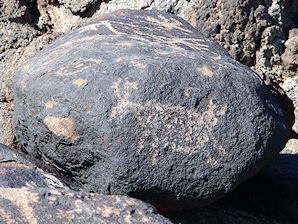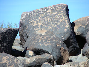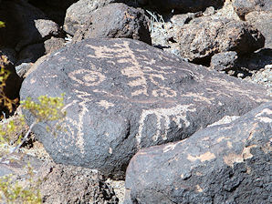 The Painted Rock Petroglyph Park Site can be found on the eastern edge of the Painted Rock Mountains and about 18 miles west by northwest of Gila Bend, Arizona. During prehistoric times the Gila River flowed west out of the Mountains of western New Mexico, and then made a wide turn near the modern day town of Gila Bend and then continued west on its journey to empty into the Colorado River. It is thought that the Hohokam were the first people to settle along the Gila & Salt Rivers of Arizona. It is known that the ancient Hohokam people once lived and farmed here. Evidence or ruins of their culture have been found in the area. Some date from their late Pioneer Period (AD 350-AD 550). Some villages dating into their Early Colonial Period (AD 550-AD 700) are found towards the north and west of Painted Rock. In addition village ruins of their Sedentary - Classic Period (AD 900-AD 1400) are found to the south and east. The Painted Rock Site is the largest known petroglyph site in the area with about 800 images pecked onto weathered basalt boulders overlaying a granite outcrop. There are about 40 smaller sites in the general area. The outcroping forms an oval structure about 400 feet long which runs in an east to west direction. The oval pile of boulders is about 20 feet tall. The majority of the petroglyphs are located upon the boulders along the eastern edge. However the petroglyphs face away in all directions from the edge. This is a very easy way to actually visit some ancient Hohokam petroglyphs in Arizona. Although considered a Hohokam rock art site, Painted Rock is on the extreme western edge of the Hohokam cultural area. As you travel east from Painted Rock the petroglyphs take on more typical Hohokam Culture characteristics, and as you travel further west, the petroglyphs take on more typical Patayan Culture characteristics. Also found here and in other nearby areas of the Gila River are other petroglyphs of even more Archaic origin. Painted Rock also bears the inscriptions of several other Historic passers-by. For example, Juan Bautista de Anza passed near here in the 1700's, followed later on in the 1800's by members of the Mormon Battalion, the Butterfield Overland Mail, and others. Then during the 1900's George Patton used this area as headquarters for his WWII tank training. The Painted Rock Petroglyph Park Site, which dates from the Hohokam Classic Period or Salado period (a.d. 1200-1450), was listed on the National Register of Historic Places on November 25, 1977. A Google Earth Map search marks the center of the Parking Lot of the Painted Rock Petroglyph Site at 33o 01' 23.25" N 113o 02' 50.75" W. The elevation is about 577 feet. According to oral tradition, the Hohokam may be the ancestors of the historic Akimel O'odham and Tohono O'odham peoples in Southern Arizona. The Hohokam people migrated north from present day Mexico around 300 BC and settled in the Gila and Salt River valleys of southern Arizona. They built rectangular pit houses from earth, rather than stone, and lived in small villages. They cremated their dead and placed the ashes in a specially prepared pit Although the Hohokam relied a great deal on hunting and gathering, they also were skilled farmers and excellent engineers. They were a peaceful people who cooperated to build large canal networks. Some of their canals were over ten miles long and used gravity to control water flow and to flush out the silt. Between the 7th and 14th centuries they built and maintained these extensive irrigation networks along the lower Salt and middle Gila rivers that rivaled the complexity of those used in the ancient Near East, Egypt, and China. These were constructed using relatively simple excavation tools, without the benefit of advanced engineering technologies. These highly successful agricultural techniques produced a surplus of food. Villages and populations grew. Over the next 1500 years the Hohokam expanded their settlements into the Tucson Basin, then to the Phoenix area, and as far north as present-day Flagstaff.