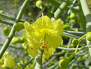We wish to thank Wikipedia, the free encyclopedia for some of the information on this page. We share images and information with Wikipedia. An Arizona native desert tree with spectacular yellow spring bloom and light green trunks. Foothill palo verde is a multitrunked, deciduous, large shrub or small tree to about 15 feet tall, rarely to 30 feet in deep soils. The yellowish-green branches are stiff and strongly upright, not drooping as in blue palo verde. Leaves are twice-pinnate, each fork bearing 3 to 5 pairs of tiny leaflets. Foliage is sparse even at the peak of the rainy season, and absent during the dry season. There are no spines beneath the leaves as in blue palo verde, but each twig terminates in a thorn. The tree flowers profusely for about 2 weeks in spring, beginning just as blue palo verdes in the same area are finishing. Flowers are not as bright than those of blue palo verde; the petals are pale yellow and the top banner petal is white. The seed pods contain 2 to 4 or more navy-bean sized seeds with thinner, softer shells than those of blue palo verde. Foothill palo verde is also more drought resistant than blue palo verde and it is not restricted to washes and it is common on rocky hillsides. These very slow-growing trees are more than a century old at maturity, and desert ecologist, Forest Shreve, says that they could live up to 400 years. Humans have also relied on the seeds for food; crops are abundant in most years. The O�odham preferred to eat the green seeds or pods; young seeds are tender and taste much like fresh peas. The Seri ate the fresh green seeds and also toasted, ground, and ate the mature seeds in a gruel. They usually raided pack rat nests to obtain the mature pods, and then winnowed the seeds. Four species of palo verde grow in the Sonoran Desert and sometimes naturally hybridize. This often makes it difficult to find plants that are not hybridized. Foothill palo verde hybridizes fairly commonly with Mexican palo verde (Parkinsonia) where both species grow in proximity to each other. Note: Mexican palo verde (Parkinsonia aculeata) has one bright orange petal ( Banner ) instead of a white petal ( Banner ) as the Foothill Palo Verde displays. It is native to the Southwestern United States in southeastern California and southern Arizona; and to Northwest Mexico in Sinaloa, Sonora, and Baja California. The plant is mostly found on slopes, and is one of the most common trees of the Sonoran Desert.
